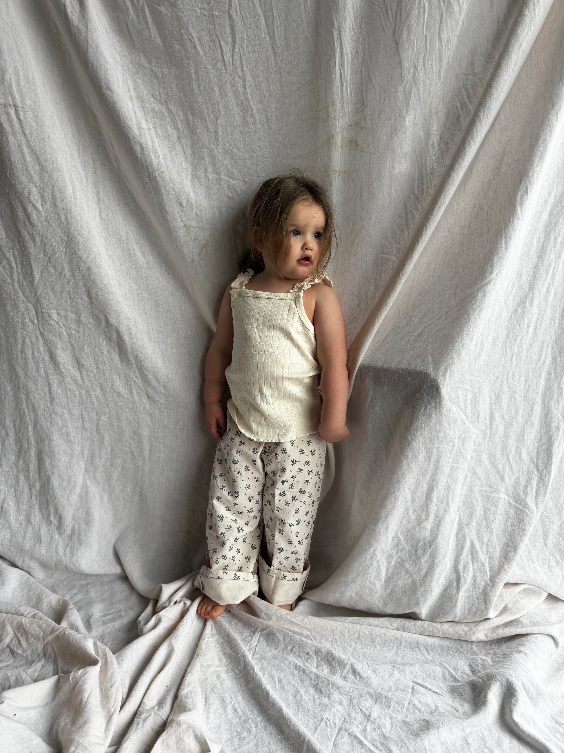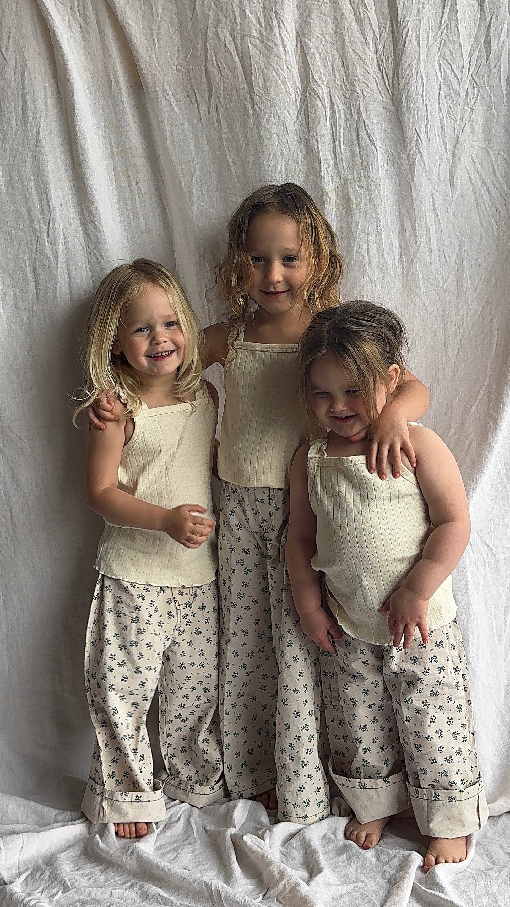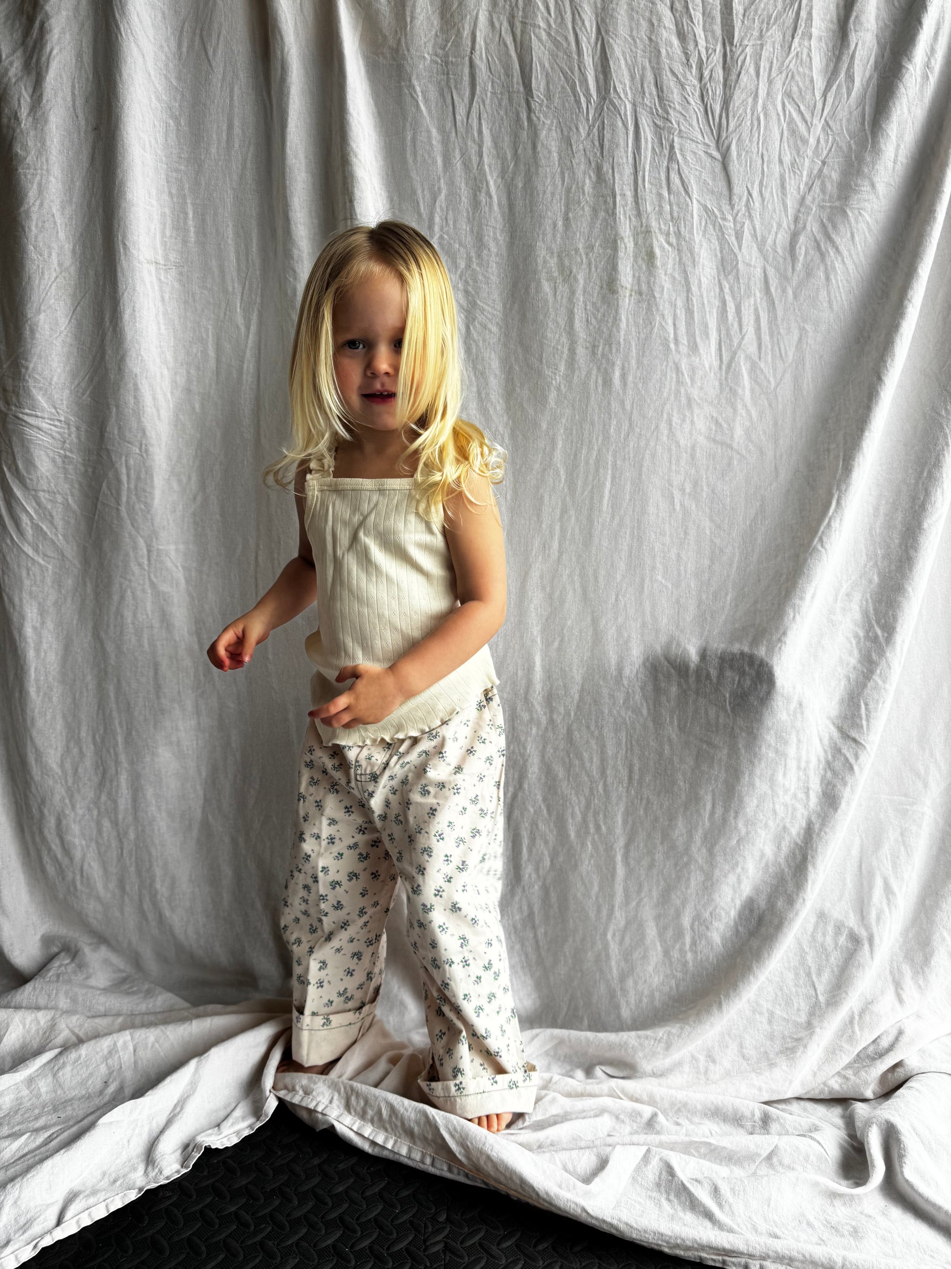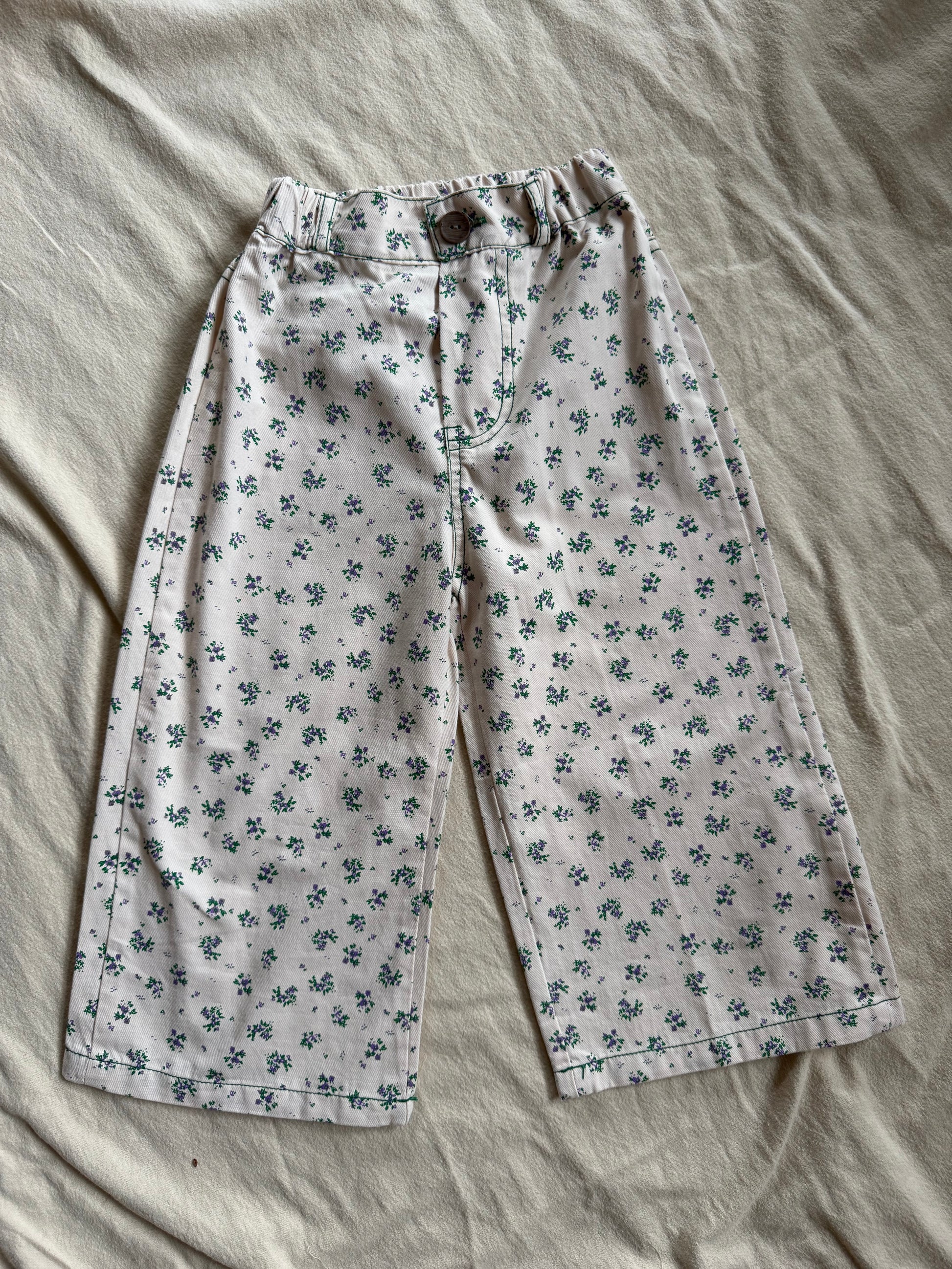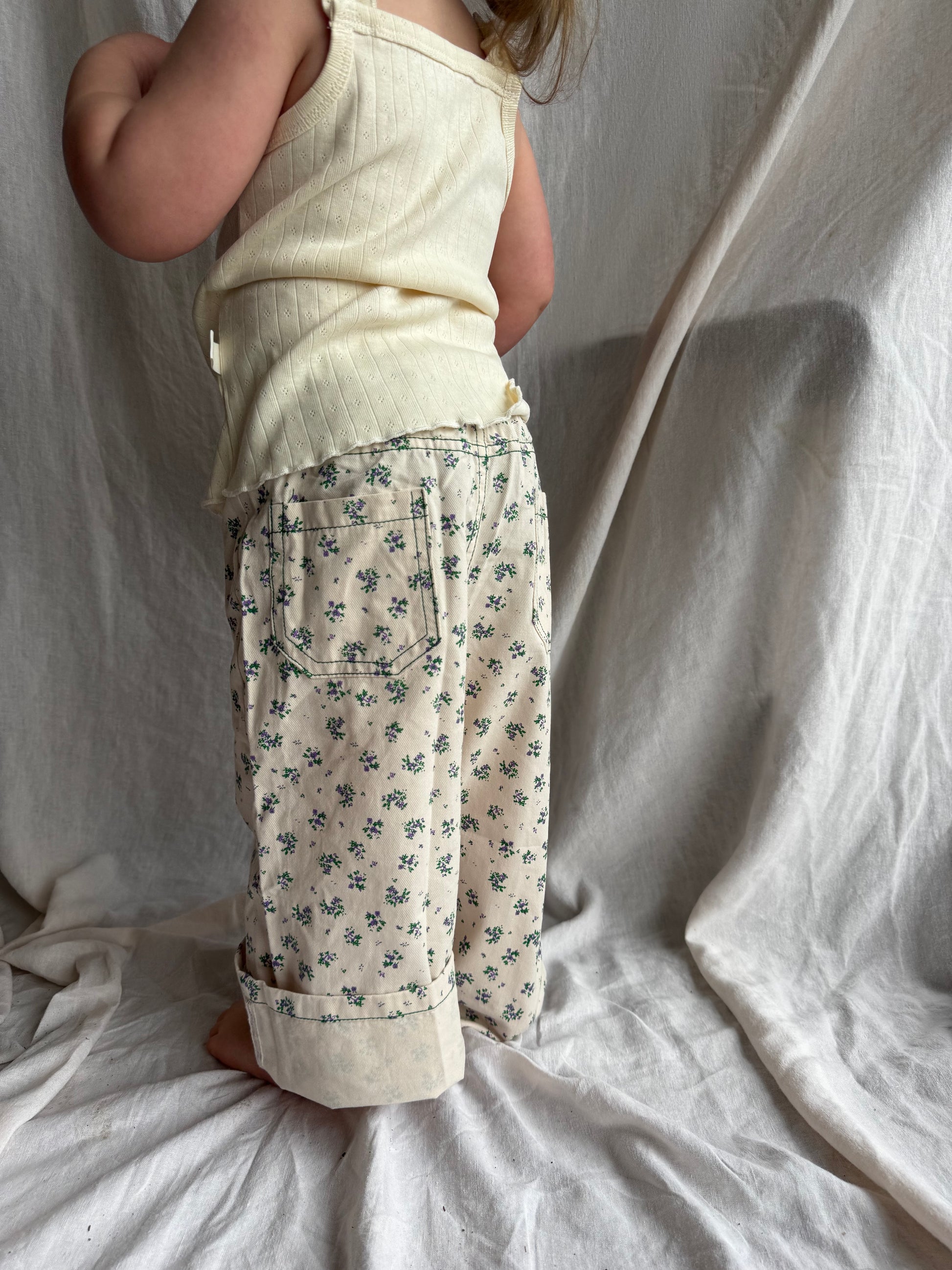 wide leg floral jeans for your girls. color is a true blush with the flowers being green & purple. can also be cuffed at the bottom.